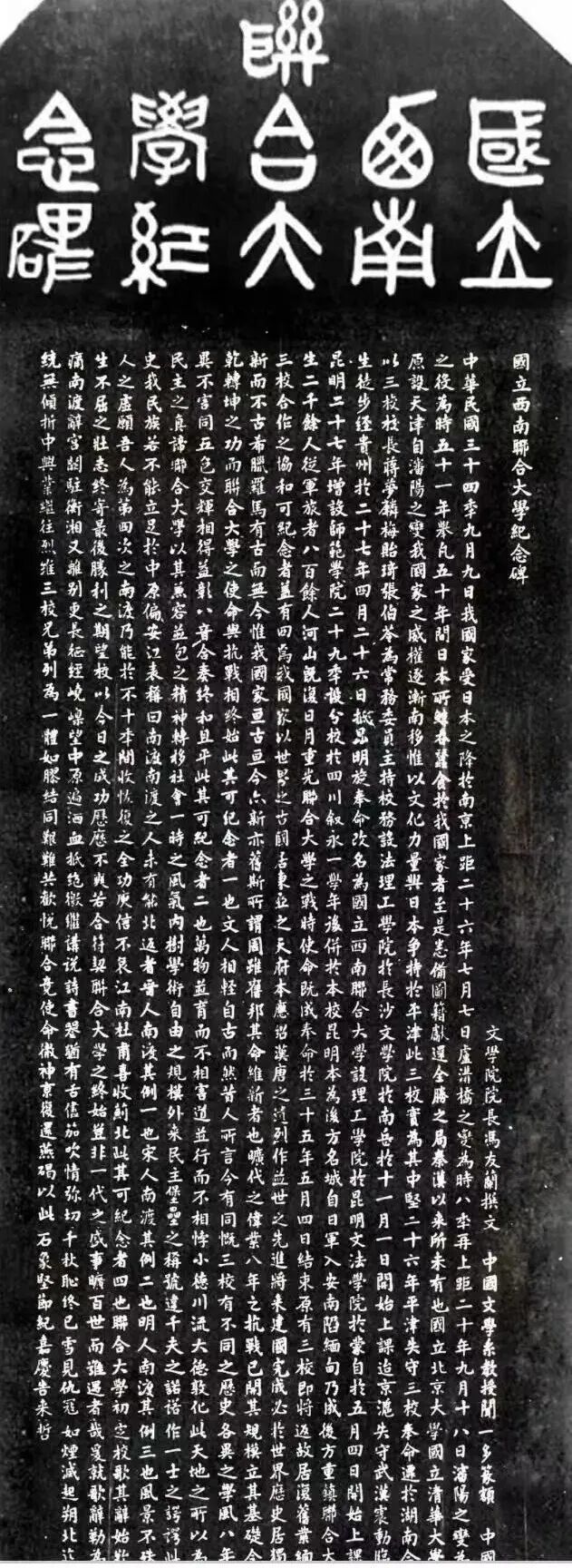 总之,以工学院为主,西南联大学生被大规模征调后出现在各个战场和各种工作场所,以他们的知识优势和满腔热血为抗战的胜利做出了应有的贡献。如今的云南师范大学校内巍然耸立着一块“国立西南联合大学纪念碑”。碑的正面阴刻着:“联大先后毕业学生二千余人,从军旅者八百余人。”碑的背面是“国立西南联合大学抗战以来从军学生题名”,上列西南联大共计832位从军学生的名单。就像西南联大校歌里所唱到的那样,“千秋耻,终当雪。中兴业,须人杰”,这些学生,正是那个时代的人杰。